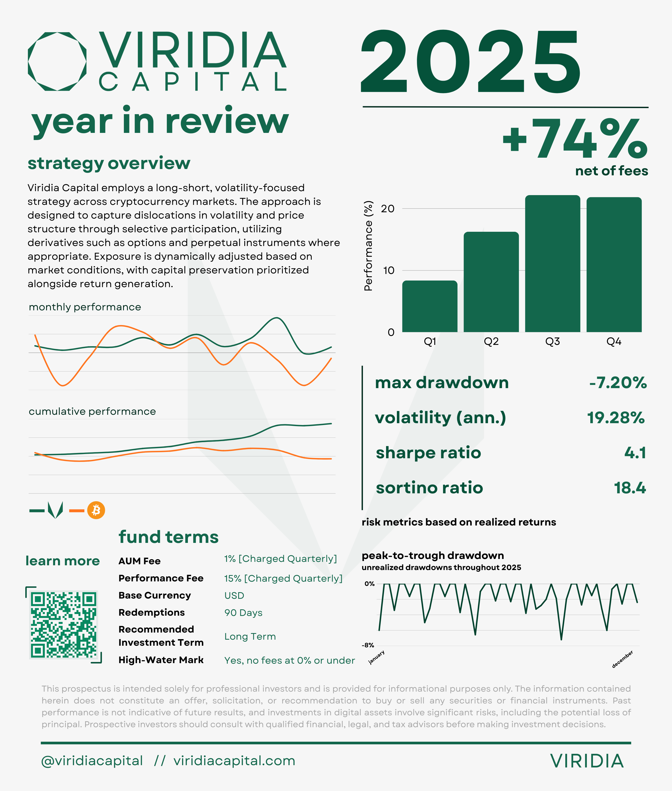 As of Q2 2025, Viridia Capital reached seven-figures in assets under management. In 2024, the strategy delivered net returns of 245%, followed by a 74% net return in 2025, all net of fees. The approach emphasizes disciplined risk controls, dynamic position sizing, and adaptability to changing market conditions.